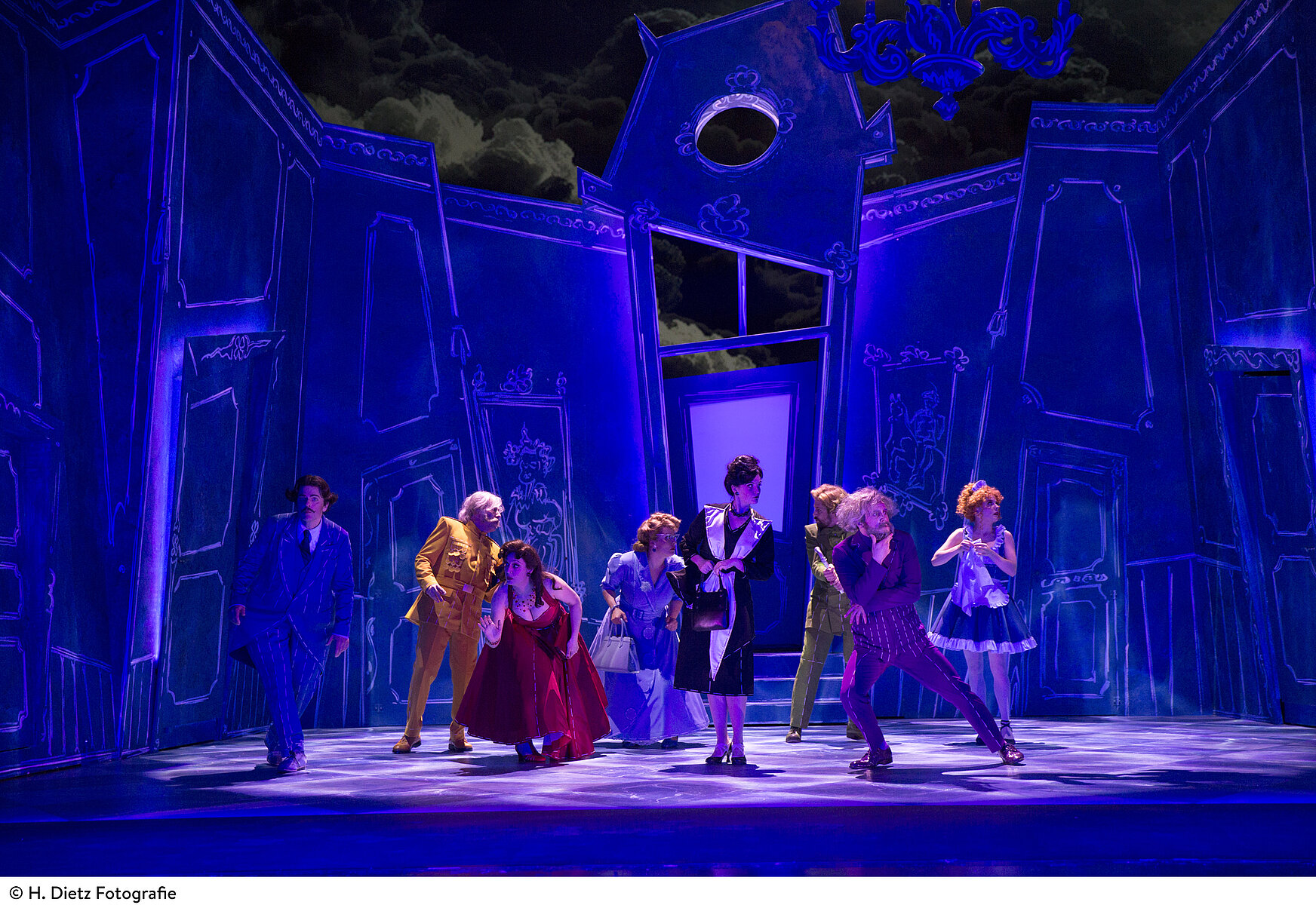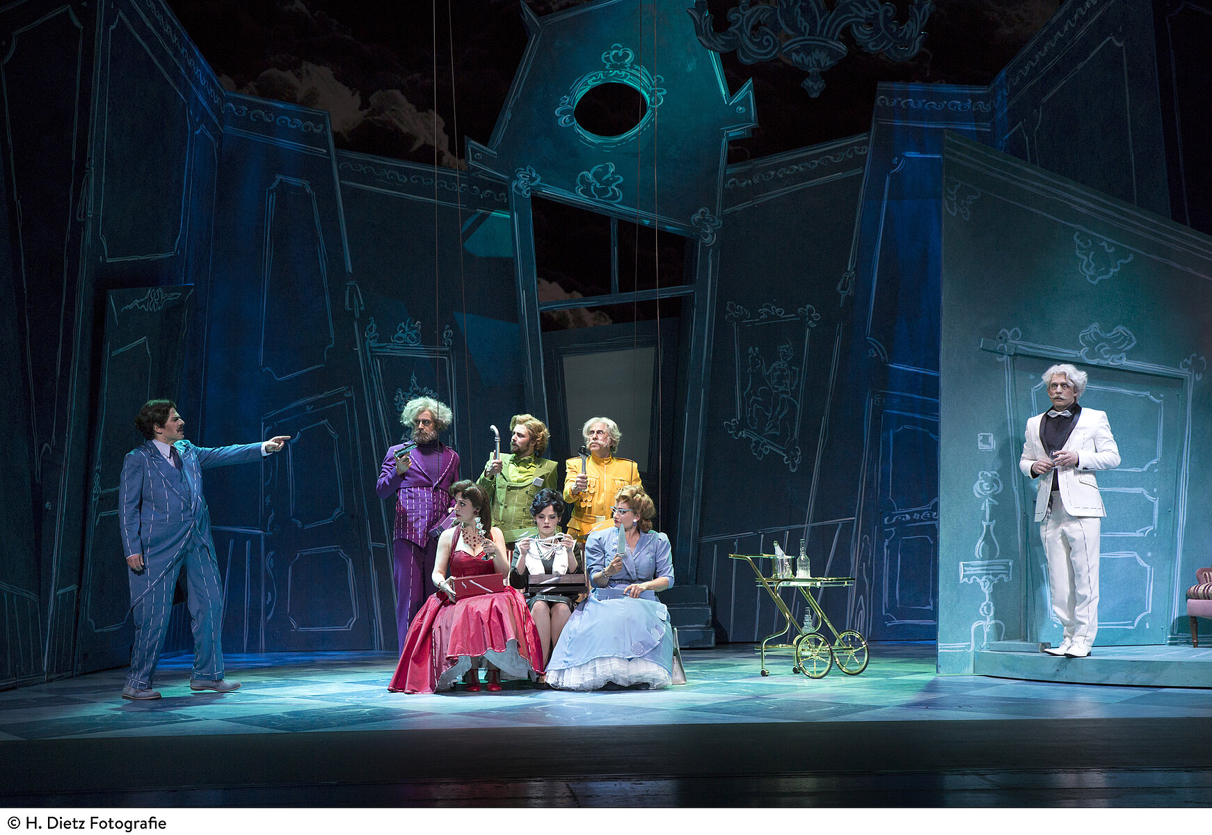 Basierend auf dem beliebten Brettspiel „Cluedo“ und der Krimi-Parodie „Clue – Alle Mörder sind schon da“ aus dem Jahr 1985, die mit unterschiedlichen Enden für Aufsehen sorgte, verwandelt Sandy Rustin das Setting in eine temporeiche, beißend humorvolle Komödie. Mit rasanten Wendungen, einem gehörigen Schuss Übertreibung und viel körperbetonter Komik nimmt sie die Ausgangssituation dennoch ernst – eine Gesellschaft auf der Suche nach einem Schuldigen. Wer ist der Mörder? Madame Roth, im Wintergarten, mit dem Kerzenständer? Oder Direktor Grün, in der Bibliothek, mit dem Seil?