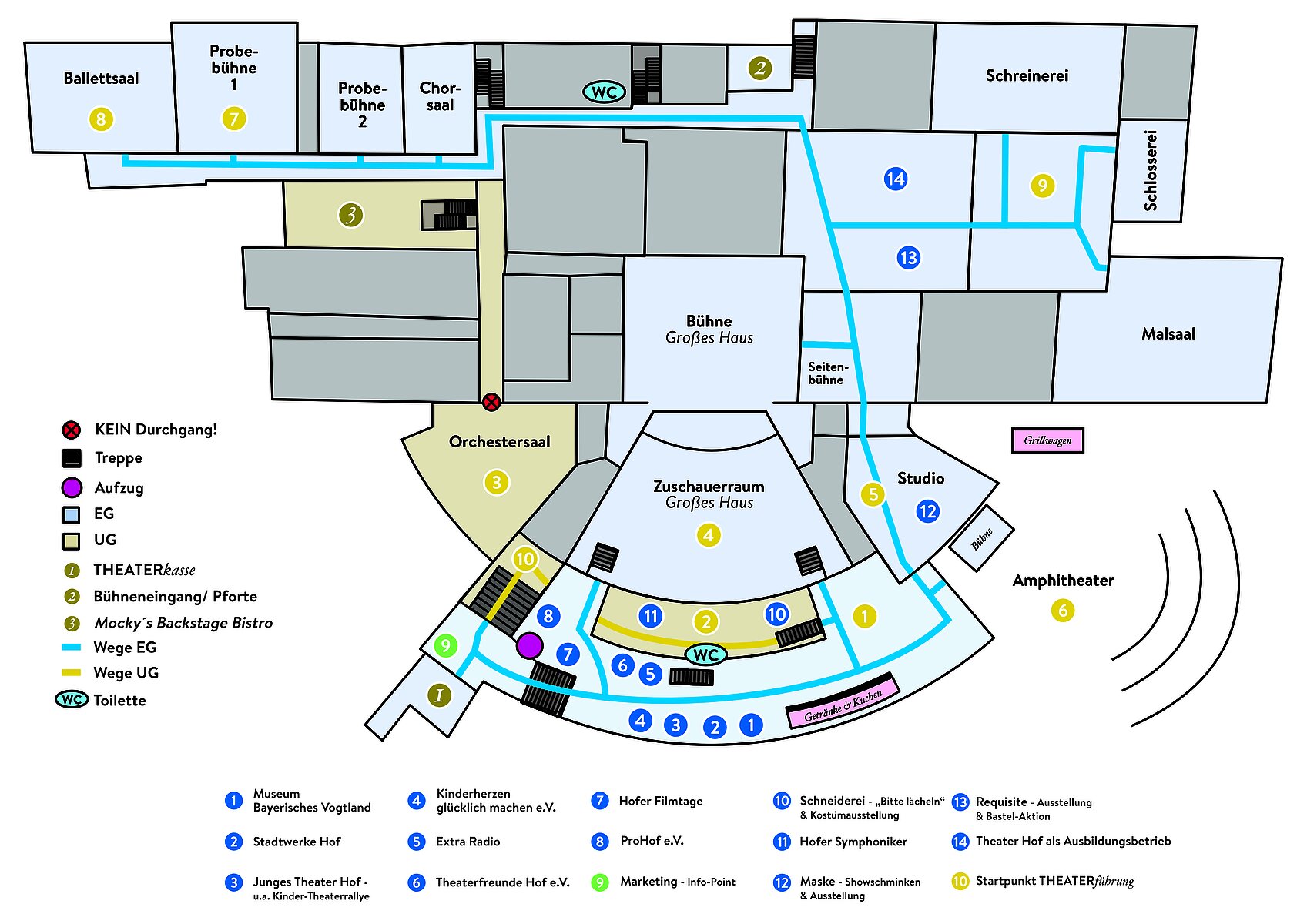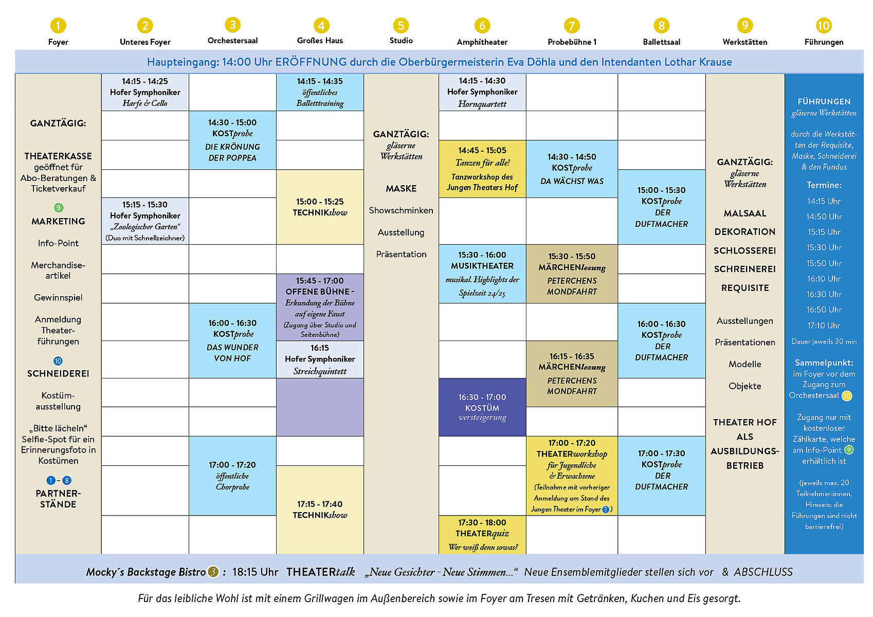 Daneben gibt es den ganzen Nachmittag über FÜHRUNGEN durch die Werkstätten des Theaters Hof (Anmeldung am Stand des Theater-Marketings im Foyer), GEWINNSPIELE, eine AUSSTELLUNG DER KOSTÜMABTEILUNG, SHOWSCHMINKEN, BASTELAKTION, die versandkostenfreie Bestellmöglichkeit von THEATER-KLEIDUNG (am Marketing-Stand; nur Barzahlung möglich) und vieles mehr – und das alles bei FREIEN EINTRITT!